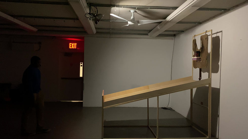 wood (found), kennedy fried chicken box (found), hennessy box (found), newport cigarette (found), fireball nips (found), chain (found), metal (found), plexiglass, wood
